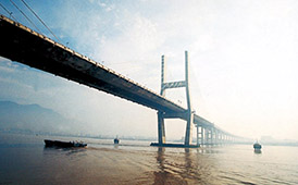 浙江温州瓯江二桥 全长1826米,主跨276米,双塔双索面预应力砼斜拉桥,1998年12月建成通车。